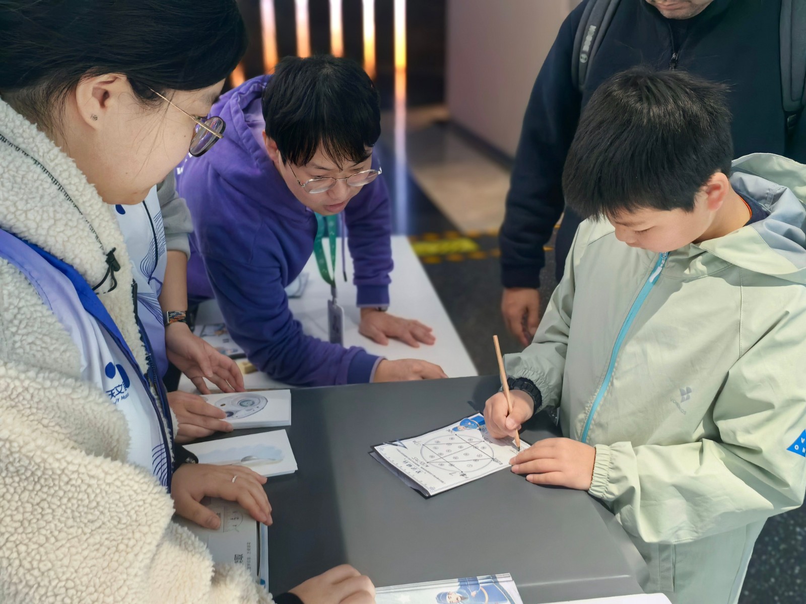 随着“征程”展区主题导览的路线,讲解员带领观众沿天文探索时间脉络,从“彗星捕手”卡罗琳·赫歇尔到“国之栋梁”叶叔华院士,逐一解读展板背后闪耀的女性力量。结合上一阶段的参观学习,“她的星空”解谜互动活动以女性天文学家生平趣事、科学成就等为线索,带领观众解锁谜题,现场互动积极、气氛热烈。
