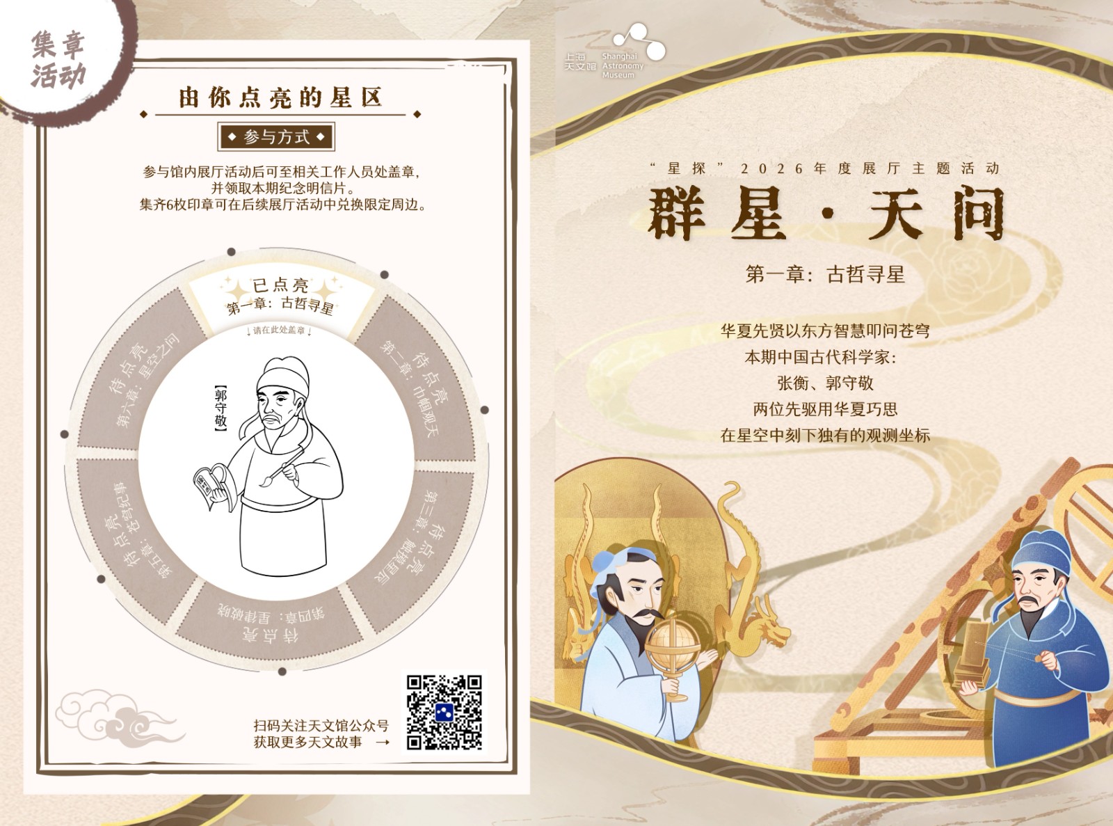 3月21日,该系列推出“古哲寻星”篇章,以中国古代天文先驱为叙事主线,聚焦张衡、郭守敬等代表性人物,以展厅活动的形式向公众展示这些隐藏在展板背后的人类先驱们,弘扬科学家精神,带领观众感悟跨越千年的天文智慧结晶。
