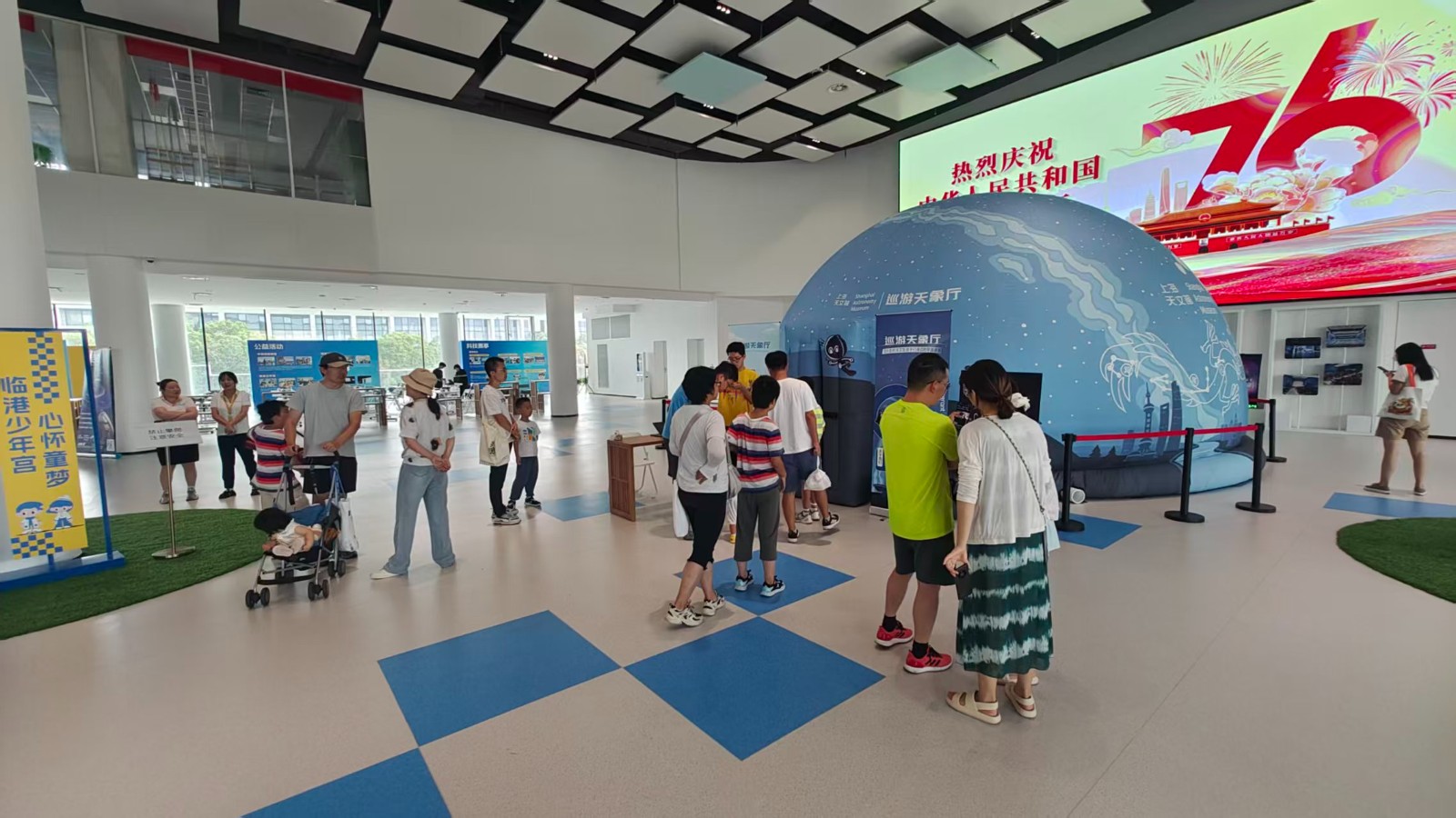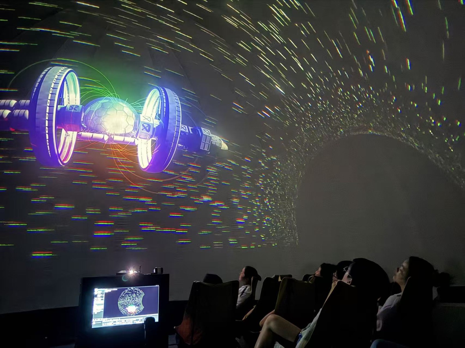 在临港,造型独特的“巡游天象厅”成为假日科普的亮点。这座移动式球幕影院如同巡游的星空使者,将上海天文馆的特色展项“光学天象厅”完整“打包”送至市民身边。观众仰卧在球幕之下,即可置身于沉浸逼真的星空下。项目融合天象演示、沉浸课堂与球幕影院等多重功能,将天文知识转化为直观震撼的感官旅程。借助4K球幕影片与立体环绕音效,为市民打造了一场全方位沉浸的科普盛宴,在假期中留下科学与浪漫交织的独特记忆。