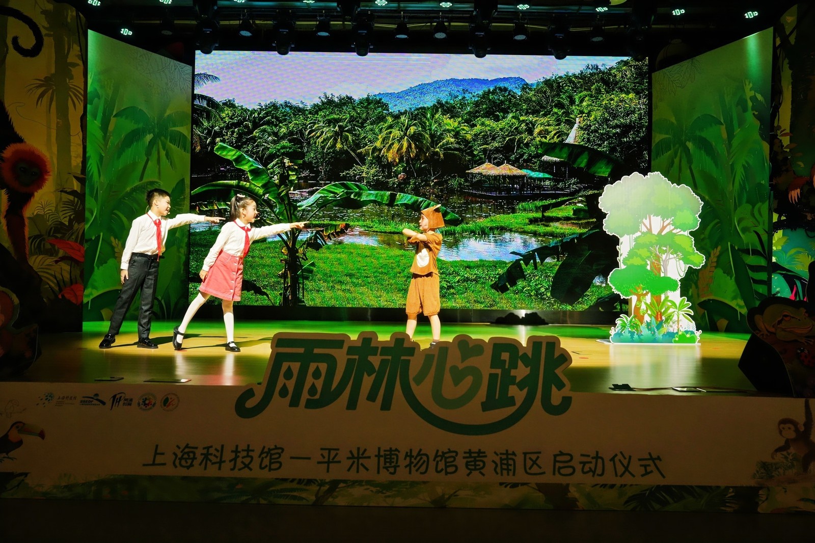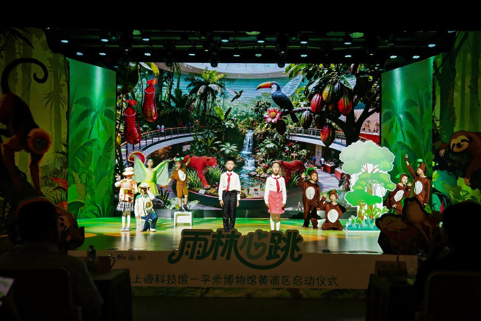 在启动仪式上,上海师范大学附属卢湾实验小学的学生们生动演绎了根据展览内容改编的科学情景剧《博物馆奇妙夜》。剧中,吉祥物丽丽、园园与AI新朋友丽园小智,借助“一平米博物馆”的引导,穿梭于“雨林秘境”“科学秘境”和“地球秘境”三大场景。同学们通过角色互动,认识了海南长臂猿、“蝶中皇后”金斑喙凤蝶等珍稀物种,并了解了热带雨林植物垂直分层的生态特点。剧情还融入了科研人员搭建树冠“绳桥”通道(生态廊道)等保护实践,生动传递出守护濒危物种就是守护人类共同未来的重要理念。该剧巧妙将科学知识、保护意识与艺术表达相结合,引发了现场观众对自然科学的浓厚兴趣。