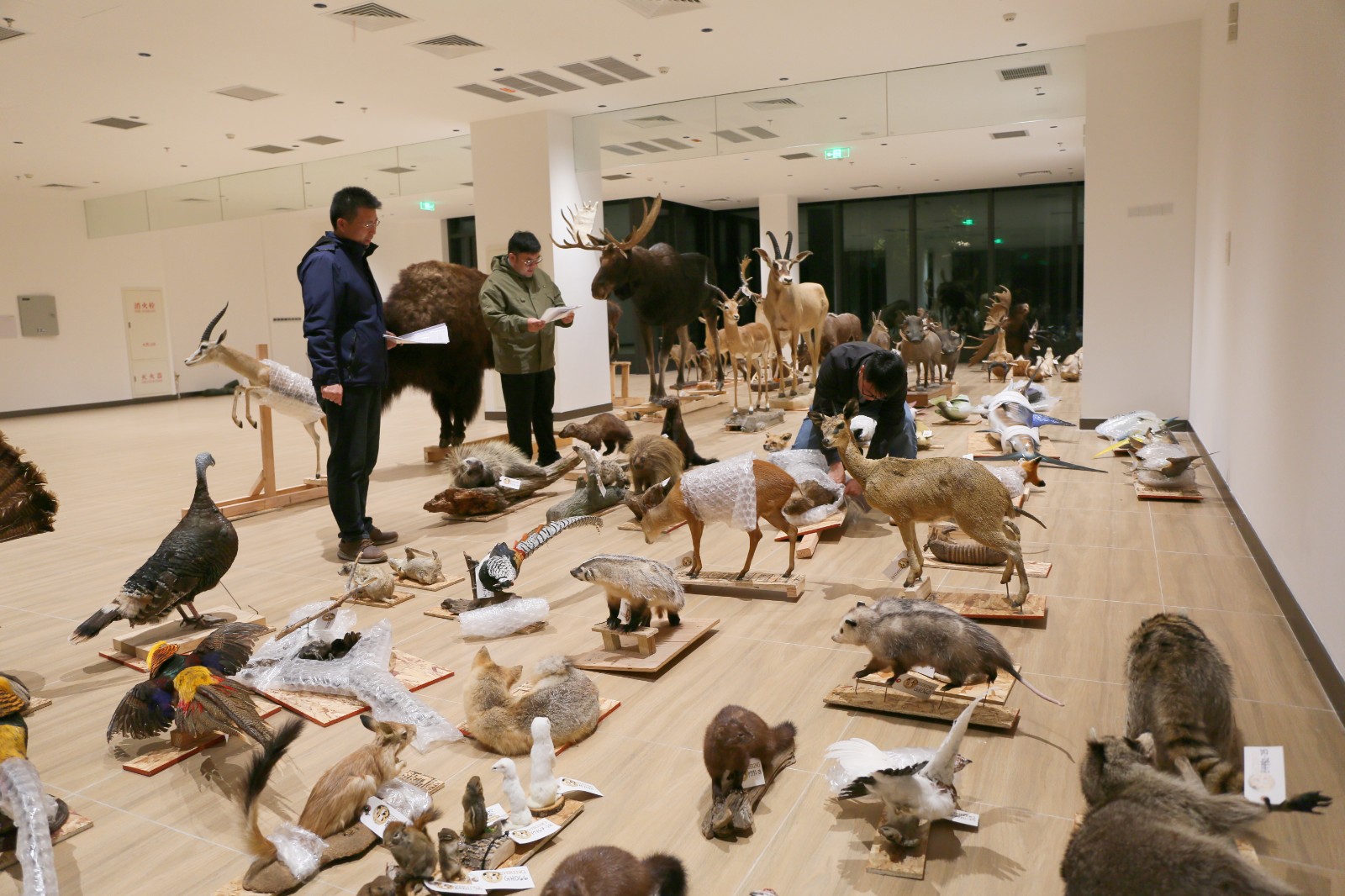 此次捐赠的标本品类丰富,涵盖兽类、鸟类、鱼类等多个类群,保存状态完好,其中不乏来自世界各地的特色物种。从当天22时运抵卸货到次日凌晨安放完毕,工作人员小心翼翼地从木箱中逐一取出标本,对照捐赠清单,细致核对标签信息,确保每件标本妥善入库。
